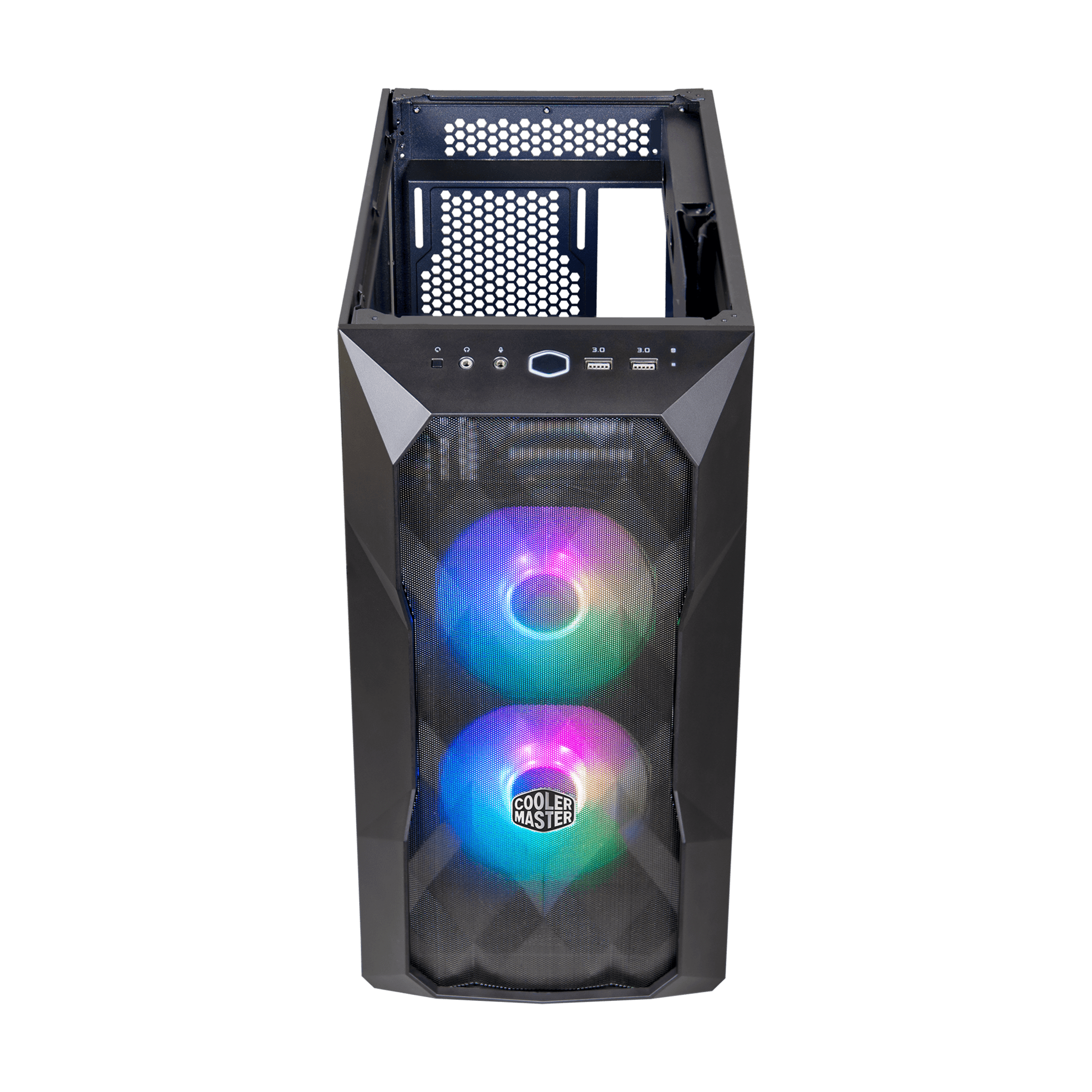 The Cooler Master MasterBox TD300 Mesh brings together modern presentation and performance with its three dimensional artistic mesh front panel. The polygonal diamond-cut facade emphasizes the illumination of two included SickleFlow PWM ARGB fans, cast various glowing effects, shifting based on the viewing angle.